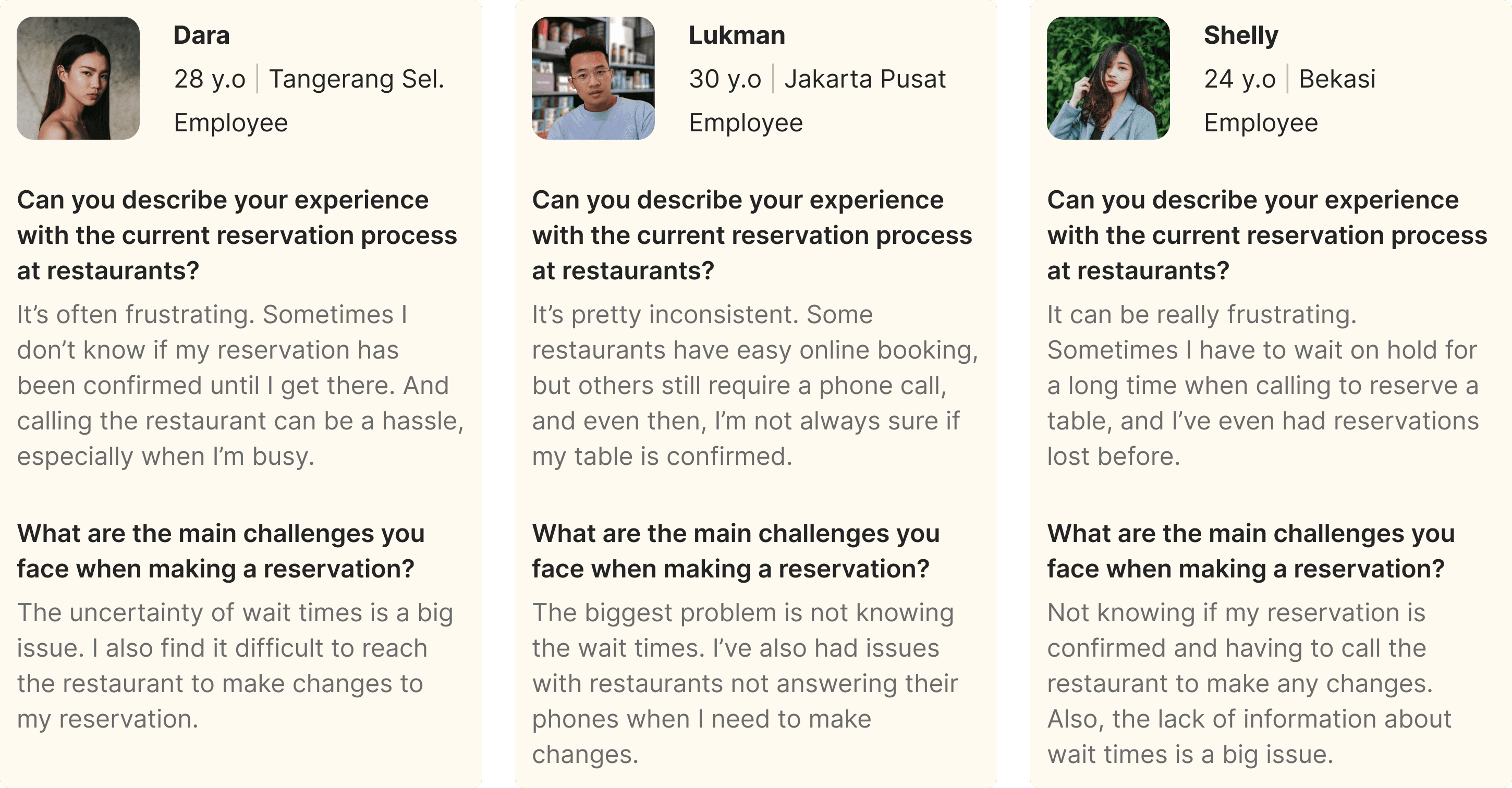 I conducted an In-depth Interview to 3 people about the main factors in visiting a restaurant. The selected respondents are 17-35 years old, lived in Jabodetabek and have the status of workers, entrepreneurs, or a student.